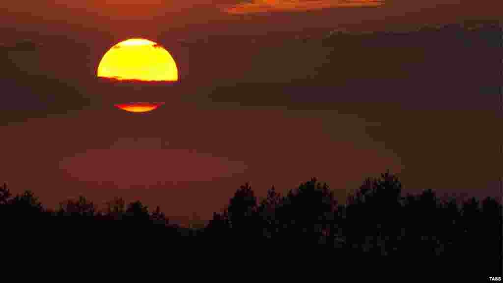 Qırım manzaraları: yarımada paytahtınıñ civarında kün batışı. Aprelniñ 23-ünde saat 05:27 yañı ay doğa.