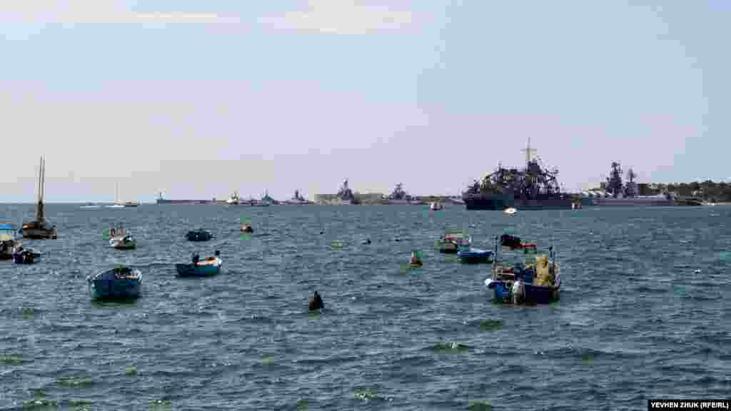 Qara deñiz flotunıñ gemileri Rusiye Arbiy deñiz quvetleri kününi qayd etmek içün tantanalı bir sırağa tizilgen.